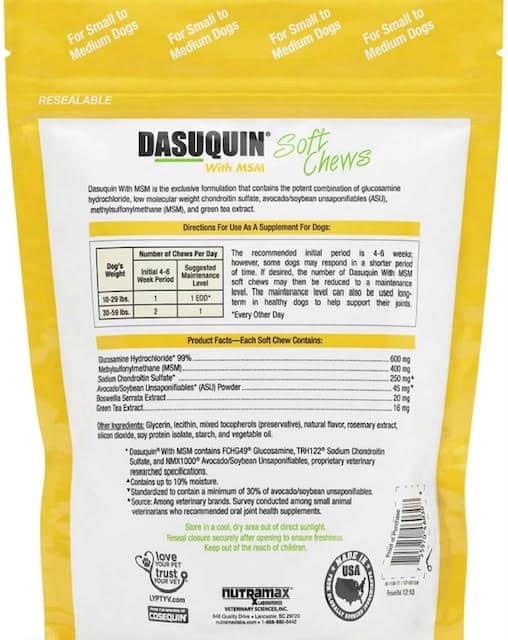 Dasuquin with MSM Soft Chews for Large Dogs is a premium joint health supplement that contains the combination of glucosamine hydrochloride, chondroitin sulfate and avocado/soybean unsaponifiables (ASU) to help support your pet’s joints. Each soft chew also contains methylsulfonylmethane (MSM), a source of sulfur, which helps support joint health. Dasuquin joint health supplements are brought to you by Nutramax Laboratories Veterinary Sciences.